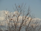 枯れ木にスズメ。冬の風物詩ですね。こう何羽も止まると、鈴なりとまではいかなくても見事なものです。