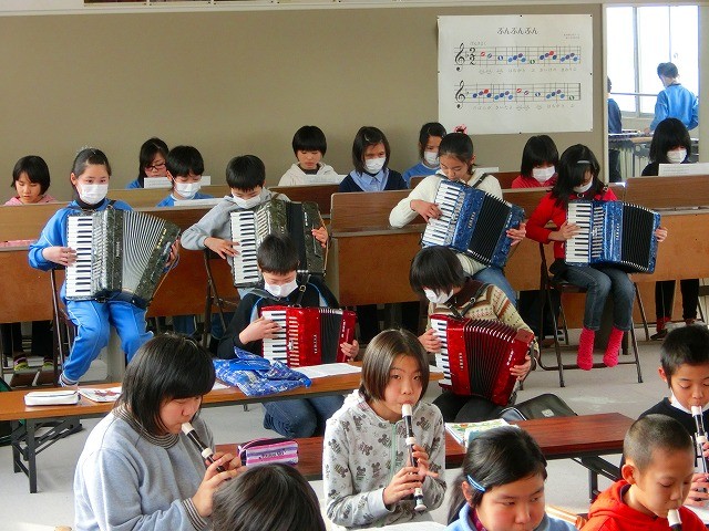 卒業式に向けて校歌の合奏練習に取り組みました。慣れない楽器に戸惑いながらも、みんながんばっています。